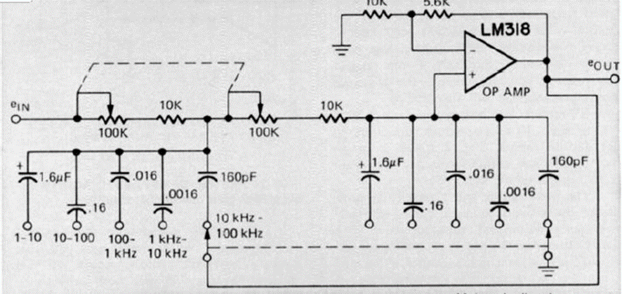 Using the 741 this circuit can be adjusted to values between 1 Hz and 100 kHz. The power supply must be symmetrical. We found it in the Radio Electronics magazine of November 1973.