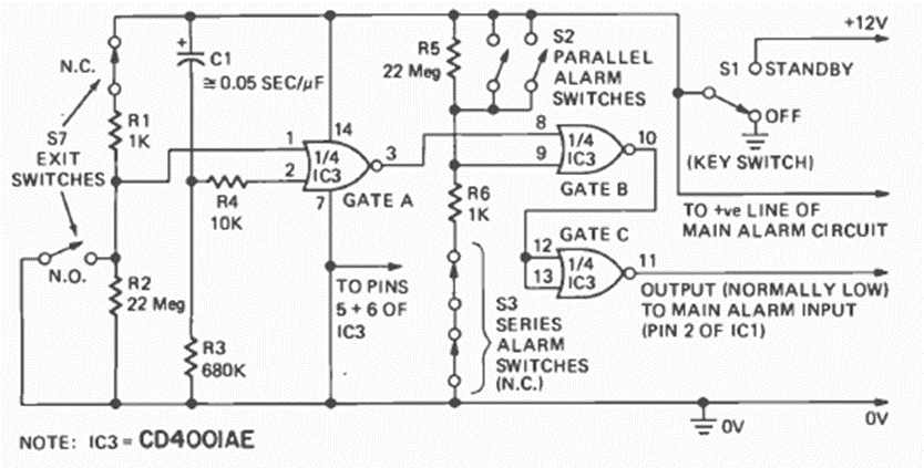 Found in the May 1975 issue of Radio Electronics magazine, this circuit turns on after a certain amount of time. This gives the owner of the premises time to leave before the alarm is activated.