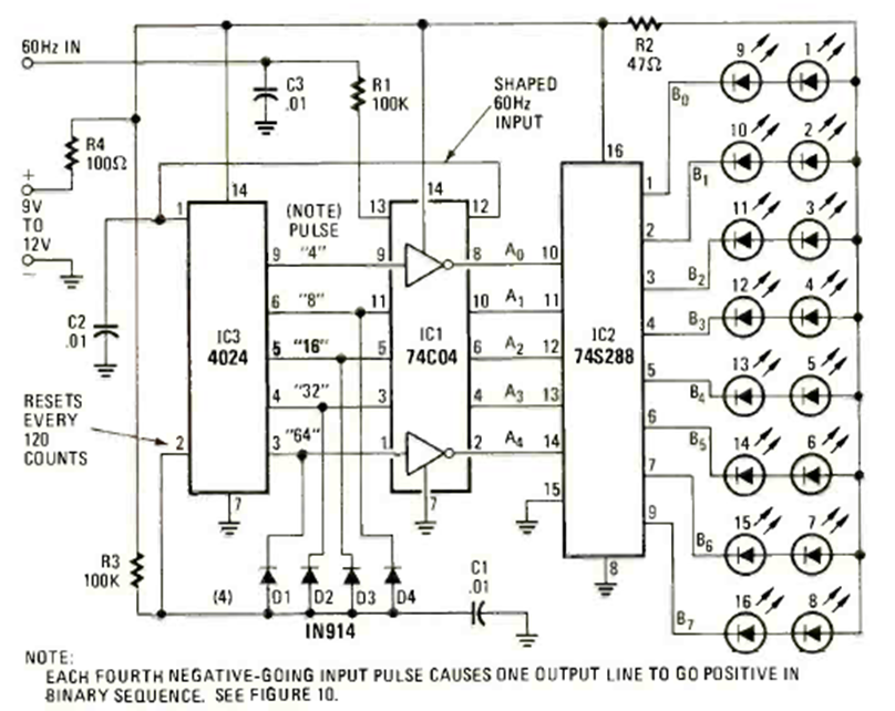 The movement of the LEDs in this circuit mimics the back-and-forth movement of a pendulum, making it suitable for clock projects. The circuit is from a Radio Electronics magazine from May 1978.