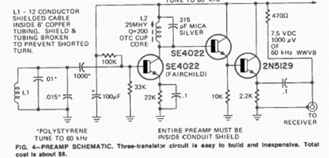 WWVB was a system that transmitted signals at the very low frequency of 60 Hz in the United States in the 1970s. The preamplifier circuit for this type of signal was published together with a receiver that we later put in the following circuit, which came out in the August 1973 issue of Radio Electronics magazine.