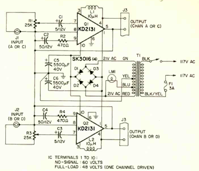 This is half of a 4-channel amplifier from a system published in the October 1971 issue of Radio Electronics magazine. The amplifier uses a hybrid module from the period. Its power is 50 W per channel, which totals 200 W for the system. Distortion is less than 1%. The transformer is rated at 42 V x 1 A.