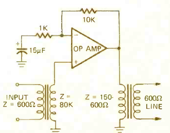 This circuit couples 600-ohm signals to a line of the same impedance consisting of an amplifier stage. The circuit with an operational amplifier of the time can be implemented with other operational amplifiers. We found it in a Radio Electronics from December 1972.