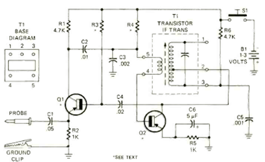 This two-transistor circuit was found in the August 1972 issue of Radio Electronics magazine. The coil is a common IF transformer for transistor radios. The signal generated is rich in harmonics.
