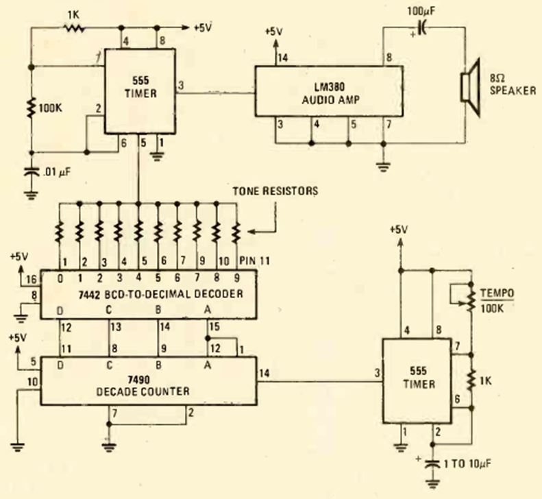 This sequential tone generator circuit was found in the July 1980 issue of Radio Electronics magazine. It uses well-known integrated circuits. The tones are generated by programming resistors.