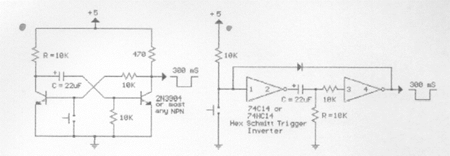 We found this circuit in documentation from the 90s. It is a common configuration that is given in two versions, using transistors and using two integrated inverters.
