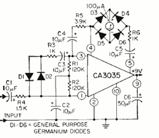 We found this circuit in the February 1970 Radio Electronics magazine. It can be used in an analog computer as a null indicator for alternating signals.