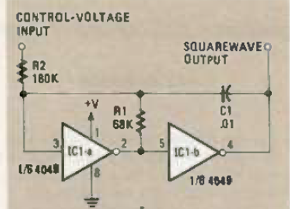 This is a simple voltage-controlled oscillator using the 4049. The base frequency is given by C1. The generated signal is rectangular, and the supply voltage can be between 3 and 12 V.