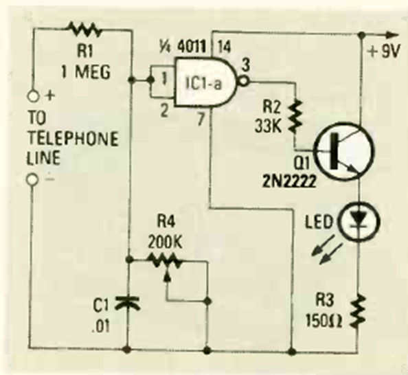 This circuit for old lines was found in the March 1986 Radio Electronics magazine. The circuit is powered by 9 V and uses an LED indicator.
