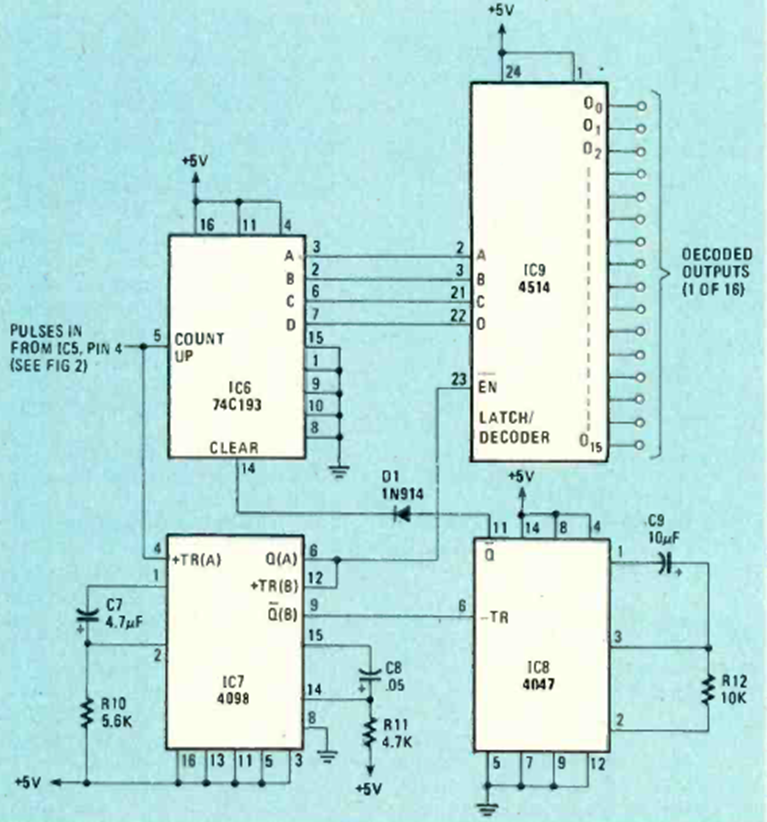 To work with the above circuits, this decoder provides an output of 10. The circuit is from an August 1984 Radio Electronics. See the above circuits.
