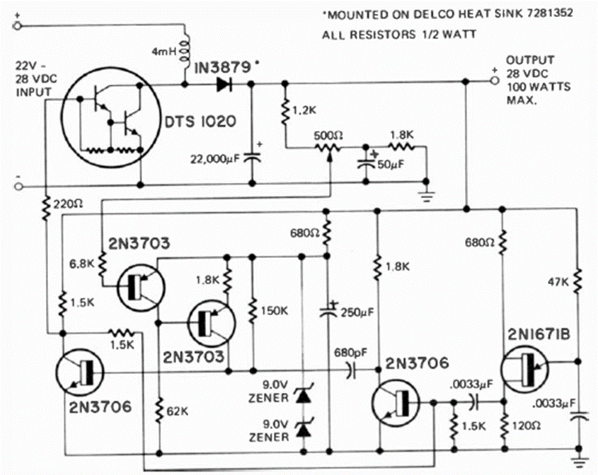 This circuit was found in the August 1973 issue of Radio Electronics magazine. The Darlington transistor is a high-power type of transistor of the time. This transistor must be equipped with a heat sink.
