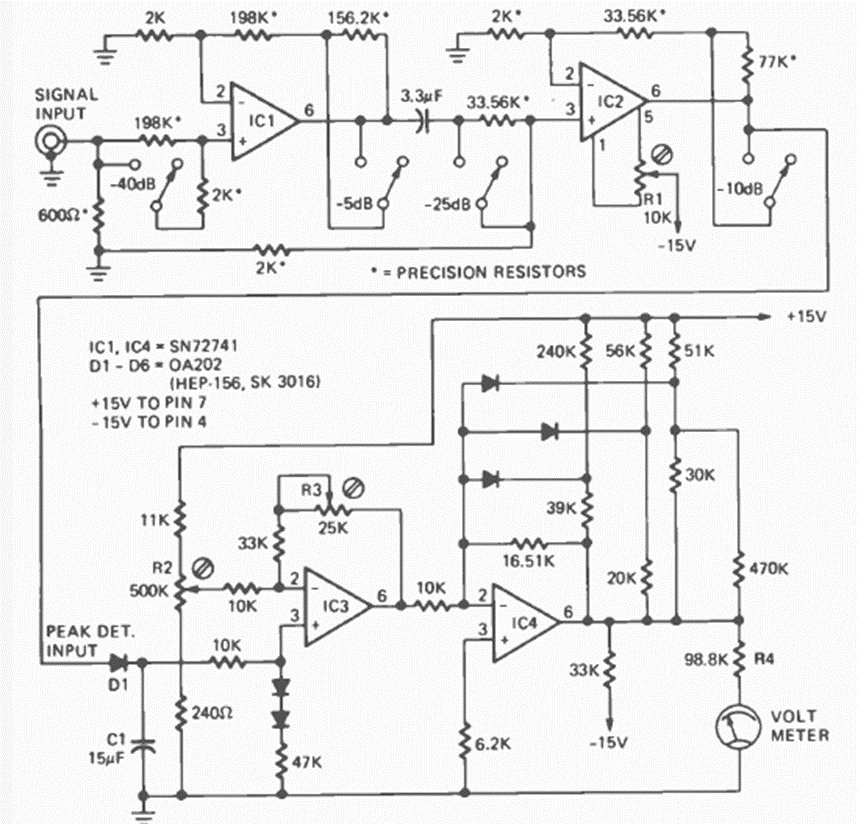 Found in the March 1974 Radio Electronics magazine, this circuit is designed to measure the level of telephone line signals, having a response of 3.6 kHz with 0 dB reference at 1 mW with an impedance of 600 ohms.