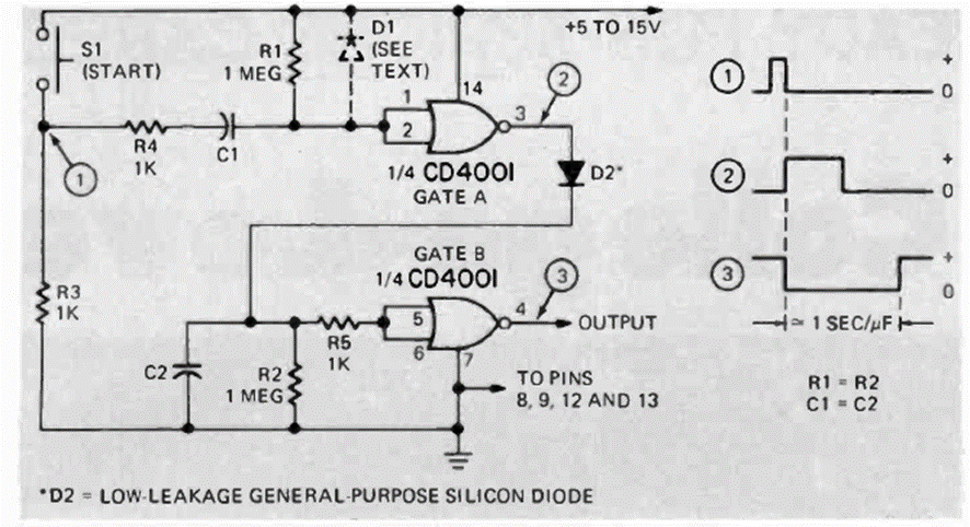 We found this circuit in the November 1974 Radio Electronics magazine. The capacitors determine the output time, and it is normal to obtain 1 second for each uF used.
