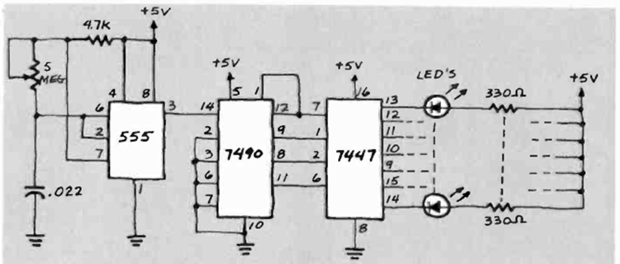 This TTL circuit has a well-known configuration, having been found in a Radio Electronics magazine from December 1980. The power supply must be 5 V.