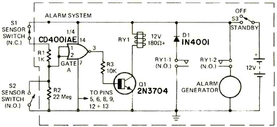 This alarm circuit was found in April 1975 Radio Electronics magazine. The circuit uses a 12 V power supply and relay but can be modified to work with other voltages.