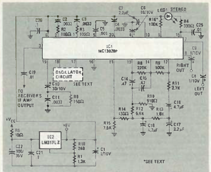This circuit for decoding QUAM AM stereo signals, a system that was little developed, was found in the January 1984 issue of Radio Electronics magazine. It used a Motorola integrated circuit specially developed for this purpose.
