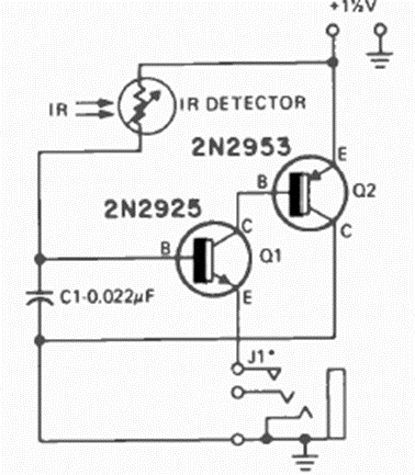 Published in Radio Electronics magazine, April 1974, this circuit helps to find infrared sources. The infrared sensor is of any type available at the time.