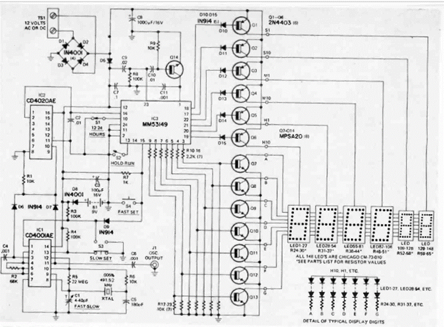 This is the circuit of a digital clock published in the January 1975 issue of Radio Electronics magazine. The clock uses a module from the period and displays hours, minutes and seconds. It is suitable for restoration.