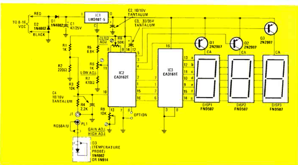 The circuit we show is part of an article that taught its complete assembly. The article is from the Radio Electronics magazine of August 1983. The thermometer was indicated for automotive applications.