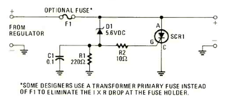 This power supply protection circuit was found in the December 1978 Radio Electronics magazine. The SCR is triggered by shortening the power supply and quickly blowing the protection fuse.