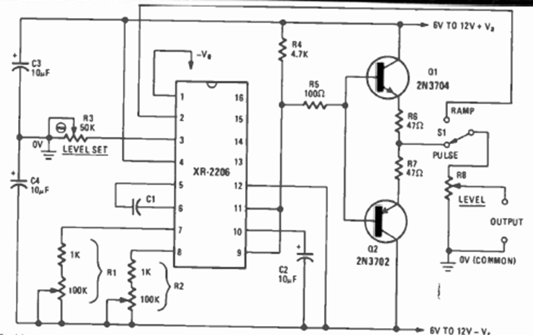 This interesting benchtop circuit was found in the May 1977 issue of Radio Electronics magazine. The circuit has frequency adjustment, and the waveform selected by a switch.