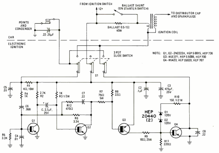 This electronic ignition for cars of the time was found in the Radio Electronics magazine of May 1976. The circuit uses power transistors that must be mounted on heat sinks.