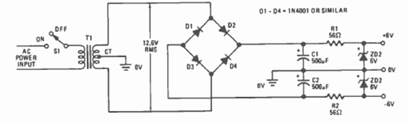We found this circuit in the Radio Electronics magazine of May 1977. The transformer voltage is 6 + 6 V, and the current depends on the zener diodes and is in the order of 100 to 200 mA.