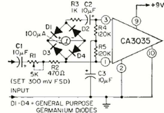 This circuit was published in the February 1970 issue of Radio Electronics magazine. The circuit uses a 100 uA full-scale microammeter as the indicator.