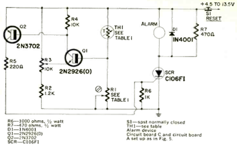 This two-transistor circuit was found in the September 1971 issue of Radio Electronics magazine. The sensor is an NTC and sensitivity adjustment is via R1.