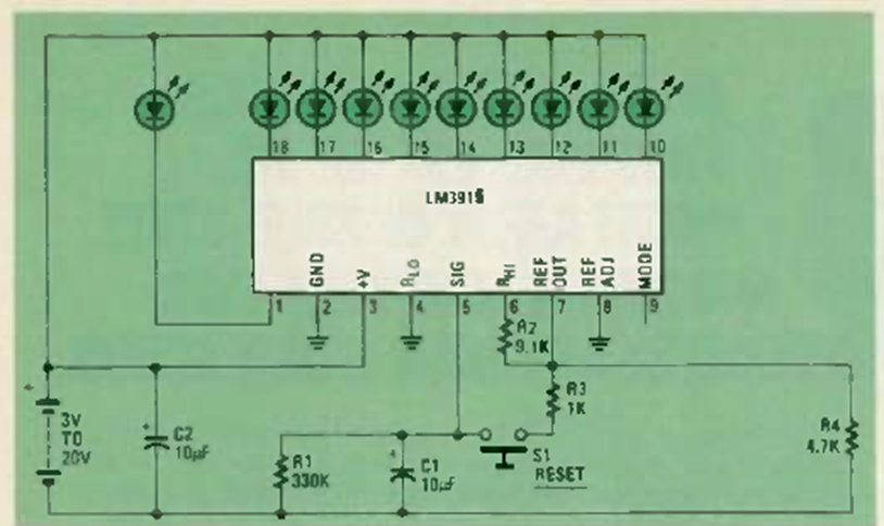 In this circuit, the LEDs light up in sequence until the last one, when the end of the timing is indicated. C1 is responsible for the timing. The circuit is from a Radio Electronics from October 1980.
