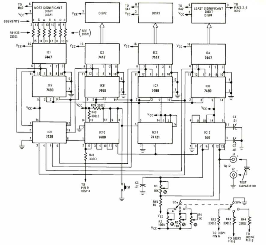 This circuit was found in the December 1977 issue of Radio Electronics magazine. The 4-digit circuit is based on TTL logic and must be powered by a voltage of 5 V.