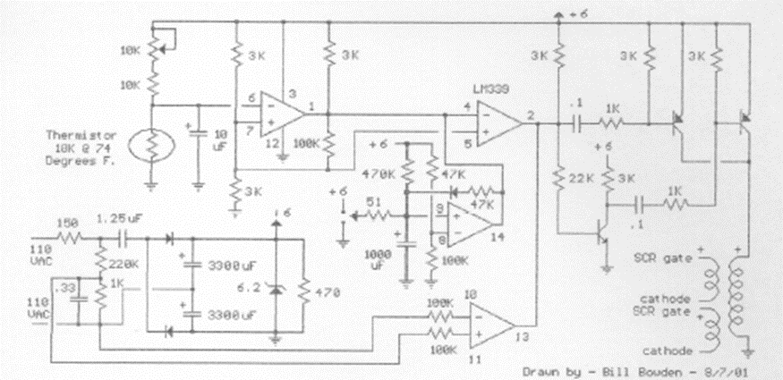 This 1 kW circuit was found in documentation from the 90s. The sensor is a thermistor, and the series potentiometer must be changed to use with thermistors with different characteristics than those indicated. The circuit uses a transformer to trigger the SCR.