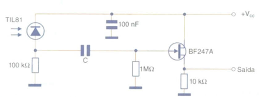 Modulated signals up to a few megahertz can be detected with the circuit shown in the figure, which uses a photodiode as a sensor and a low-power field-effect transistor as an amplifier element. The sensitivity depends on the 100 kΩ resistor in series with the photodiode, which can be changed according to the application. The capacitor C has its value chosen in the range of 1 nF to 100 nF, according to the modulation frequency of the received signal. The power supply can be between 5 V and 15 V, typically. The sensor can be any photodiode or even a PN junction of a phototransistor.