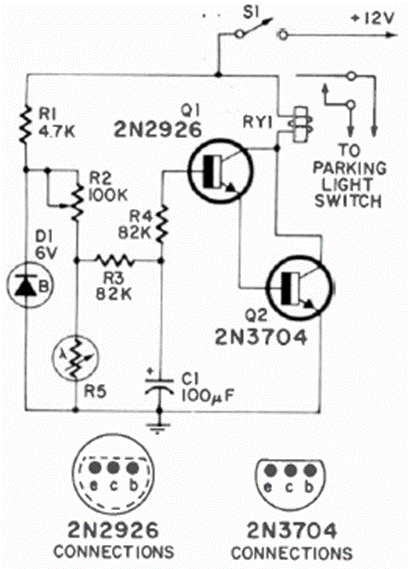 This automotive circuit was found in the April 1971 Radio Electronics magazine. The relay is 12 V and the flashing frequency is determined by the setting of R2.