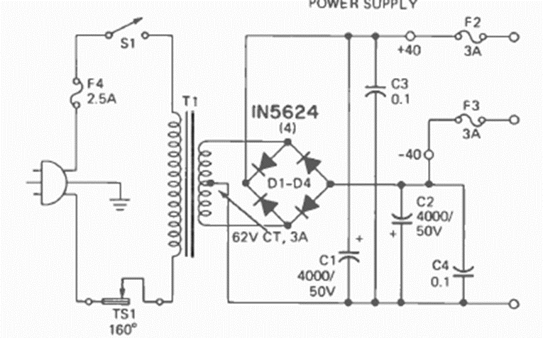 This is the power supply for the amplifier in the previous circuit. We found it in the same Radio Electronics magazine from March 1973. The transformer is 62 V x 3 A and the power supply is symmetrical.