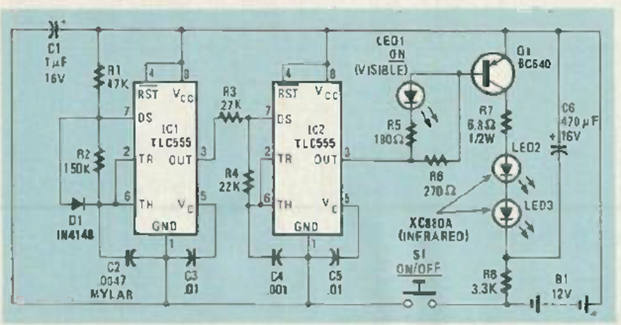 This is the transmitter for a remote-control system published in the August 1986 issue of Radio Electronics magazine. The circuit uses two 555 CMOS transistors to drive two series LEDs.