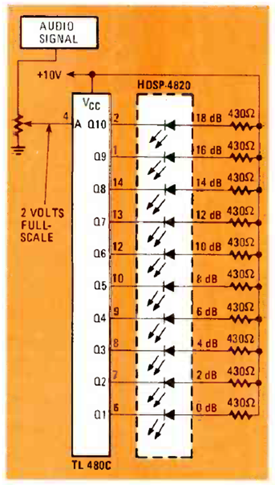This is one of many possible circuits for the LM3914 IC as an audio indicator. The trim pot has typical values between 10k and 100k depending on the audio signal strength. The circuit is from a Radio Electronics from February 1981.