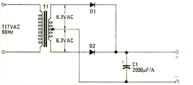 This power supply with only 4 components has basic full-wave configuration. The diodes depend on the current and the transformer voltage determines the output voltage.