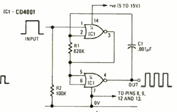 The figure shows how to obtain an 800 Hz astable circuit controlled by an external signal. The circuit is from a Radio Electronics magazine from April 1976.
