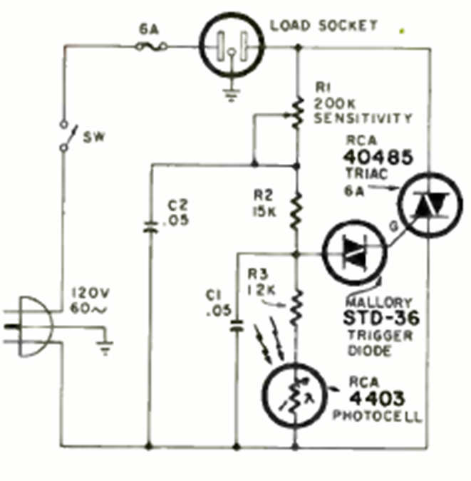 This circuit for incandescent lamps was found in the February 1972 Radio Electronics magazine. The triac is rated according to the lamp power and the sensitivity adjustment is made in R1.