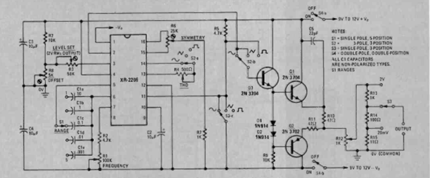 This nice function generator circuit with the XR2206 was found in the May 1977 Radio Electronics magazine. The circuit has a transistor output stage.