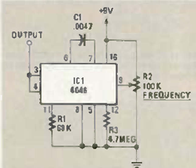 This circuit was found in November 1984 Radio Electronics magazine. The frequency is given by C1 which can be changed to other ranges.