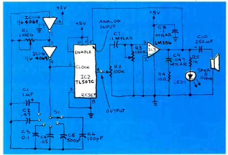 This circuit generates various types of sounds and can be used as a toy. The circuit is from Radio Electronics from January 1983. The amplifier can be replaced with a more modern type.