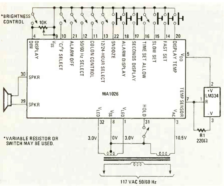 This improvement of the MA1026 digital clock and thermometer, improved over the previous two circuits, is from the same Radio Electronics magazine from February 1981. The circuit has a transformer with special voltages.