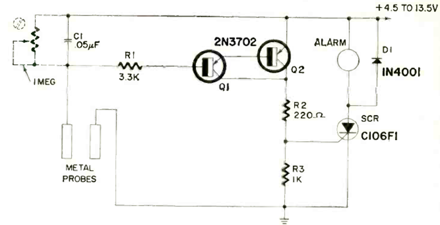 This circuit was found in an article in the August 1971 Radio Electronics magazine. The source must be isolated from the power grid and instead of the alarm, a relay can be used to activate a more powerful system or water pump.