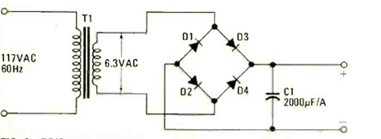 This non-regulated power supply uses a single secondary winding transformer. The secondary voltage determines the output voltage, and the diodes must be rated according to the transformer current.