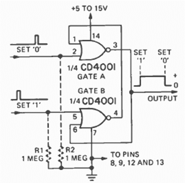 The configuration shown was found in the October 1974 Radio Electronics magazine. The integrated circuit used is the CD4001 and the power supply depends on the application.