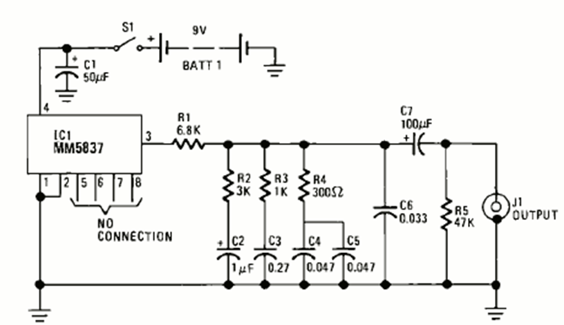 We found this circuit in the January 1978 issue of Radio Electronics magazine. The integrated circuit is from that time and is powered by a 9 V battery. The signal must be applied to an amplifier.
