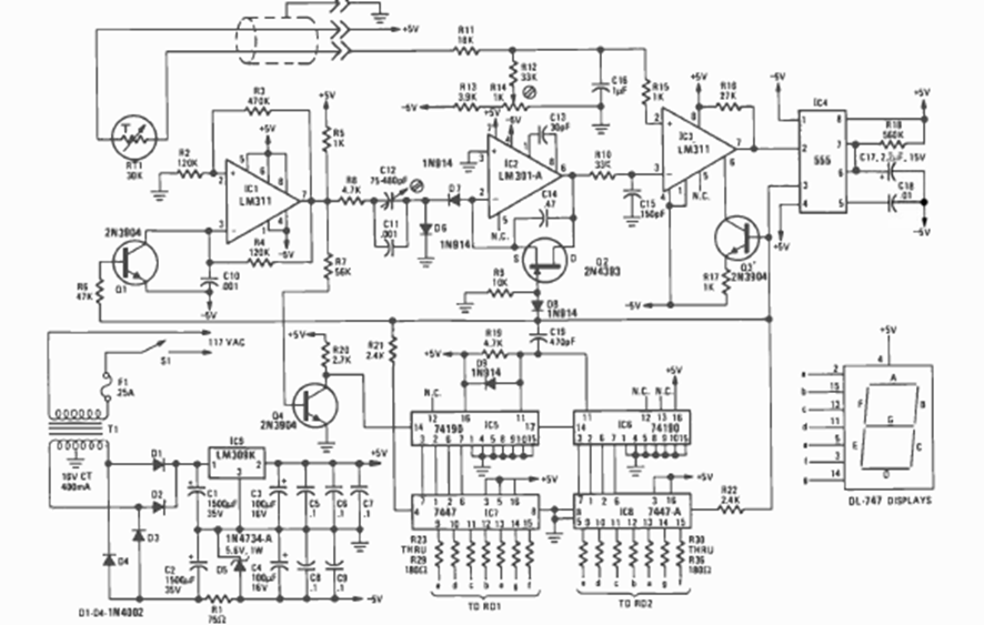 This circuit was found in the September 1977 issue of Radio Electronics magazine. The power supply is included, and the logic used is TTL.