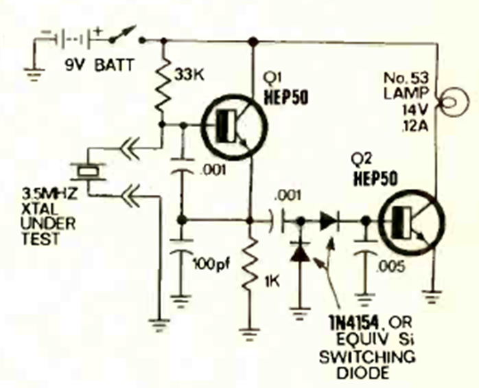 This circuit was originally designed for testing crystals used in color televisions, but it works for any crystal up to about 20 or 30 MHz. The circuit is from a Radio Electronics magazine from December 1971.