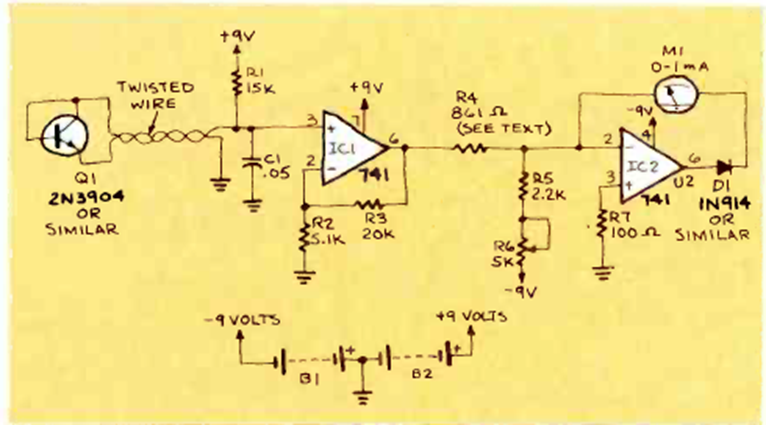 This dual-operator thermometer circuit was found in the September 1982 issue of Radio Electronics magazine. The sensor consists of a general-purpose transistor.